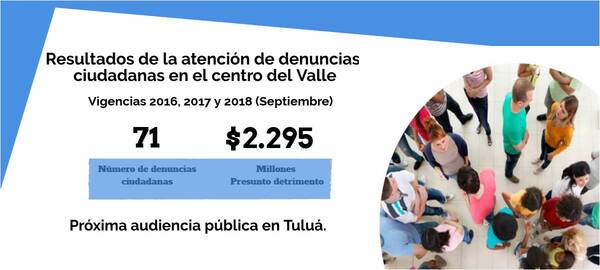 Las denuncias ciudadanas tramitadas por la Contraloría Departamental en centro del Valle,  han permitido evidenciar un presunto detrimento aproximado de $2.295 millones, durante las vigencias 2016, 2017 y lo corrido del año 2018.