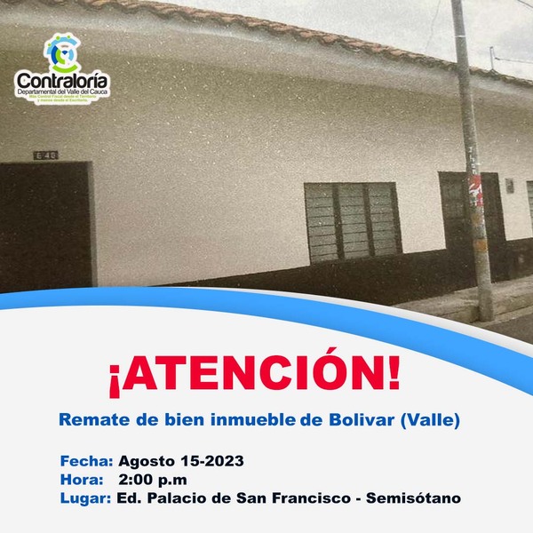 Contraloría Valle realizará remate de inmueble de Bolívar (Valle)