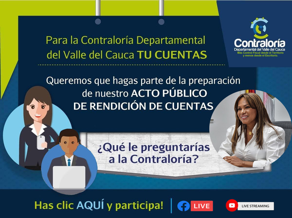 Como acción previa a este acto, Contraloría Departamental del Valle del Cauca, les inviata a contribuir con sus requerimientos, sugierencias y aportes, a la preparación de un evento que responda a las expectativas ciudadanas. ¿Qué le preguntarías a la Contraloría? Para dejar su opinión, por favor acceda al siguiente link: https://forms.gle/ Zw8YzWhWkUNDxAWh9
