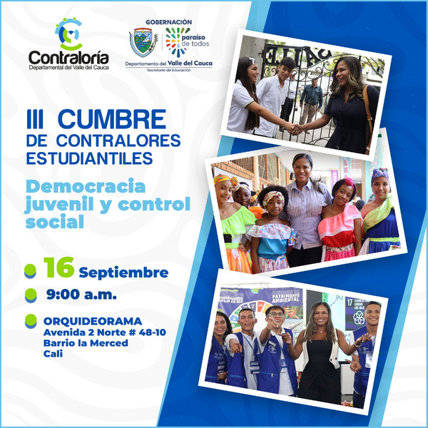 La Contraloría Departamental del Valle del Cauca, en articulación con la Secretaría de Educación Departamental y la Secretaría de Desarrollo Social y Participación Ciudadana del Valle, realizará la III Cumbre de Contralores Estudiantiles, mañana martes, 16 de septiembre, a partir de las 9:00 a.m., en el Orquideorama de Cali (Av. 2 Norte #48-10, Barrio La Merced).