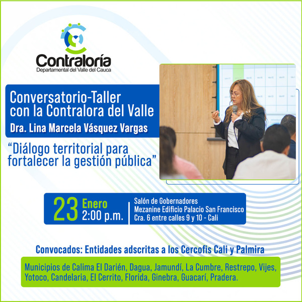La Contraloría Departamental del Valle del Cauca realizará mañana viernes 23 de enero, en la ciudad de Cali, el Conversatorio–Taller “Diálogo territorial para fortalecer la gestión pública”, un espacio de encuentro y construcción conjunta con alcaldes, alcaldesas y representantes legales de las entidades sujetas de control de los municipios del sur del departamento. El evento tendrá lugar en la Gobernación del Valle del Cauca – Mezanine, a partir de las 2:00 p. m.